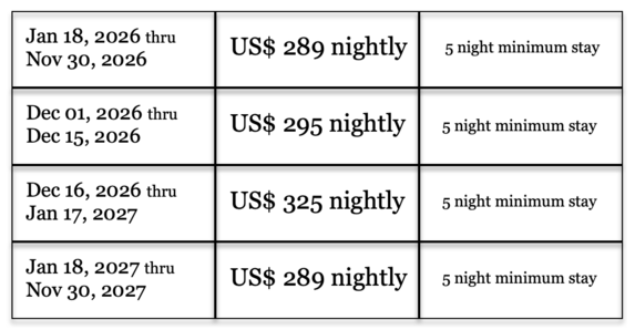Rates are subject to change until reservation has been confirmed. Rates are based on 4 (four) person occupancy. Water and Electricity is included up to a limit of average daily usage (normal use of water and electricity.) An additional guest will be charged US$ 20.00 per day. Excess water and/or electricity use at additional charge. Your meter will be read upon arrival and settled upon departure. Please refer to contract for details.